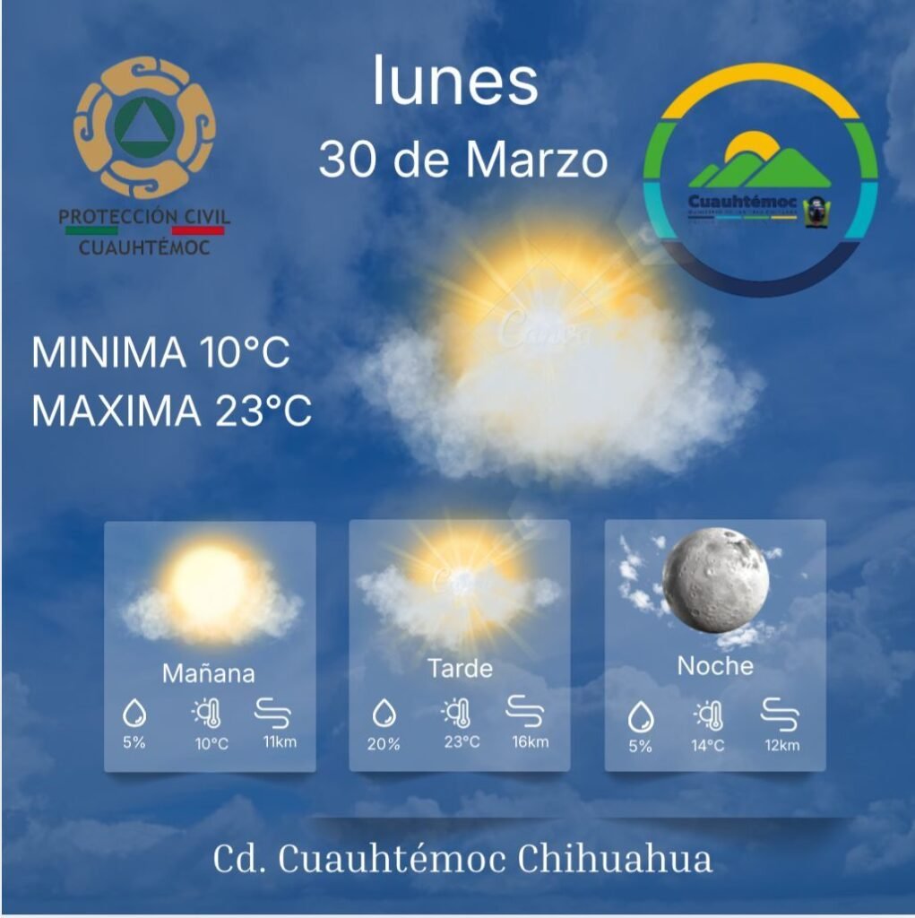 Hoy en Ciudad Cuauhtemoc, la mínima será de 10° entre 6 a.m. y 7 a.m., y la máxima, de 23°